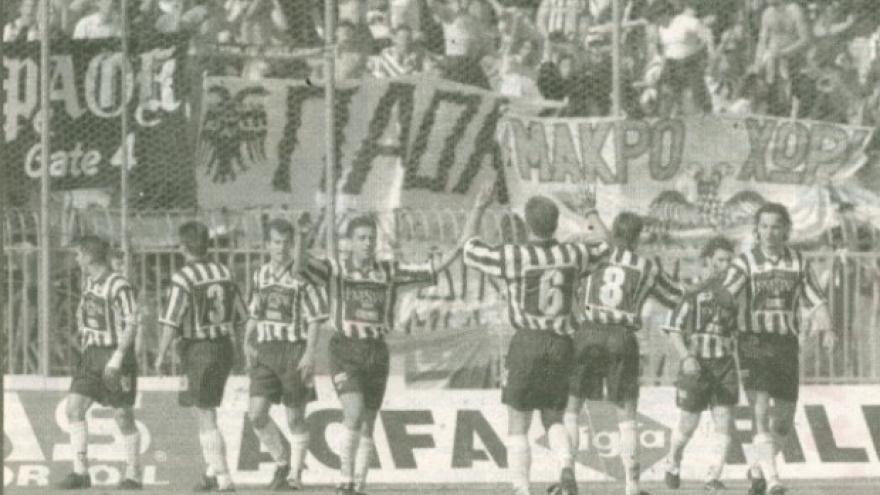 * Στην αρχική εικόνα διακρίνονται οι παίκτες του ΠΑΟΚ να πανηγυρίζουν ένα από τα δύο γκολ που σημείωσαν στο εκτός έδρας παιχνίδι με την ΑΕΚ, στις 4/5/1997, σε παιχνίδι της 31ης αγωνιστικής, του πρωταθλήματος, της περιόδου 1996-1997 ...