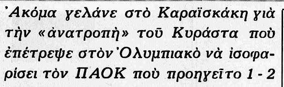 Ήταν η εποχή που η Τούμπα αποτελούσε το μεγάλο φόβητρο της ομάδας της Μουνιχίας και με όσα ακούσαμε τα τελευταία χρόνια για τον τρόπο που γινόταν οι κληρώσεις σε παγκόσμιο επίπεδο, άντε να μας πείσει κάποιος για το αδιάβλητο της διαδικασίας! Εκείνη ήταν η 3η συνεχόμενη χρονιά που η κλήρωση έφερνε τον γάβρο γηπεδούχο με εμάς για το Κύπελλο, αλλά την επόμενη σεζόν ακολούθησε και 4η!!! Και ο νοών νοείτω!!! Αυτά συνέβαιναν κάποτε στον θαυμαστό κόσμο του ελληνικού ποδοσφαίρου και ο γάβρος μάζευε κούπες!