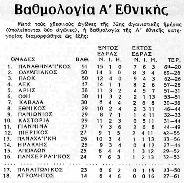 * Το πρωτάθλημα το πήρε τελικά ο ... βαζελος (για αυτόν δούλεψε πιθανότατα τόσο ο Μαρινέλης στο ματς με τον ΠΑΣ στην Τούμπα όσο ΚΑΙ ο "χασάπης" Τσουκαλαδέλης στη Φιλαδέλφεια!) με 54 βαθμούς, στη 2η θέση ισοβαθμήσαμε εμείς και ο γάβρος με 52 βαθμούς, με την ομάδα της Μουνιχίας να υπερτερεί στη διαφορά τερμάτων (70-27 έναντι 63-27)!