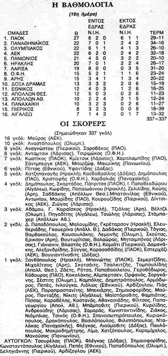 * Ο ΠΑΟΚ τη σεζόν 1984 αναδείχθηκε για 2η φορά στην ιστορία του Πρωταθλητής Ελλάδας, έχοντας 19 νίκες - 8 ισοπαλίες - 3 ήττες, συγκέντρωσε 46 βαθμούς (2-1-0 η βαθμολογία), με τέρματα 54-26...