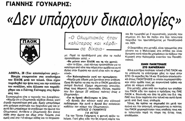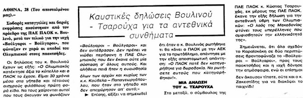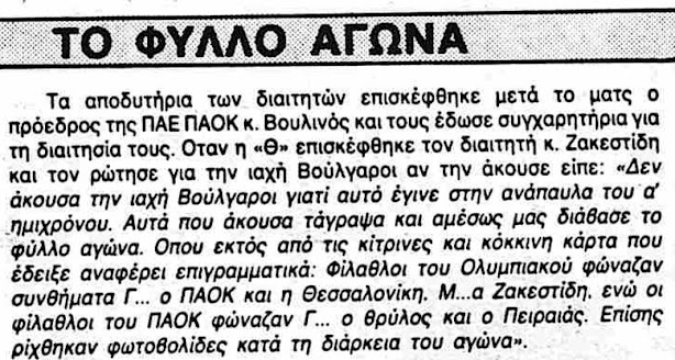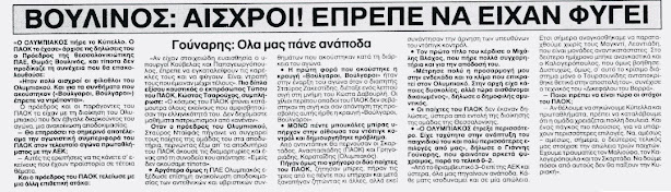 Θωμάς Βουλινός: «Δεν έχω συναντήσει χειρότερους φιλάθλους. Να τους χαίρεται η διοίκηση του Ολυμπιακού που δεν έκανε ούτε μια ανακοίνωση για τα αντεθνικά συνθήματα που ακούστηκαν! Τριάντα χιλιάδες αλήτες φώναζαν Βούλγαροι, Βούλγαροι και ο Παπαγεωργόπουλος με τον Κούβελα δεν αποχώρησαν σε ένδειξη διαμαρτυρίας»
